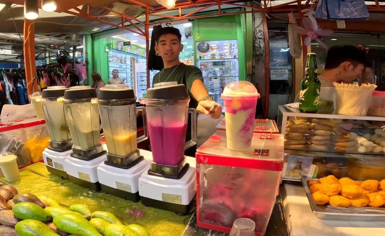 Während meiner Street-Food-Tour in Manila entdeckte ich einen Smoothie-Verkäufer, der unglaublich leckere frische Fruchtsmoothies für nur 1$ anbot. Der Smoothie kam in einem riesigen Becher und schmeckte wie ein Milkshake — perfekt, um sich in der tropischen Hitze abzukühlen. Die große Portion war jedoch etwas zu viel, um sie bequem in Manilas heißem Klima zu genießen.